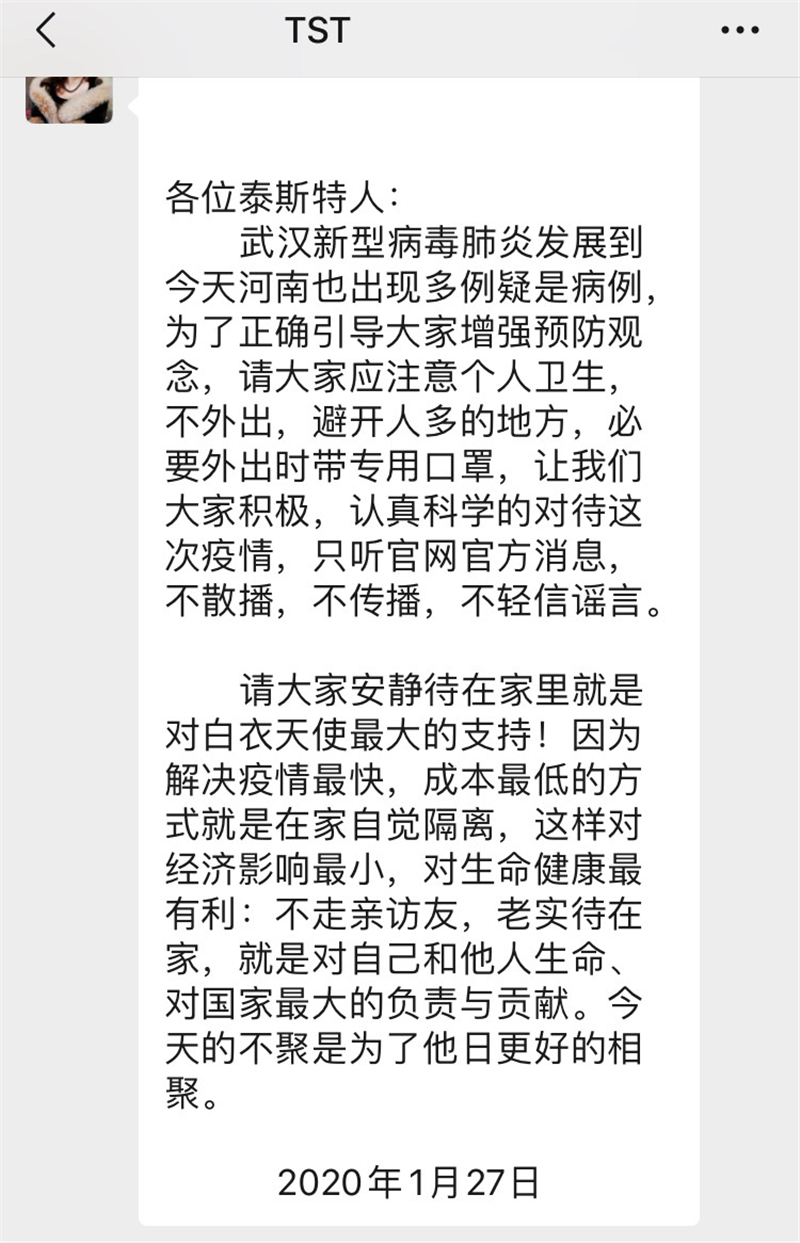 面向全體員工發(fā)布“告全體泰斯特人書(shū)”,統(tǒng)一全員思想,對(duì)抗疫情。