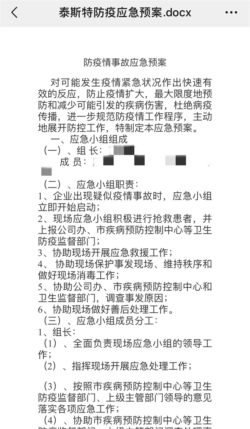 (1)泰斯特公司制定復(fù)工生產(chǎn)實(shí)施方案、應(yīng)急方案、疫情防控工作方案等,確保嚴(yán)格落實(shí)、全面防控。
