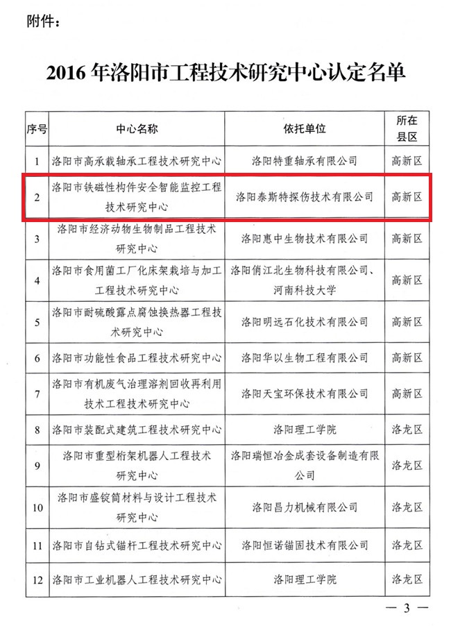 根據(jù)《洛陽市工程技術研究中心管理辦法》(洛市科【2006】95號)規(guī)定,經(jīng)組織申報、初審、現(xiàn)場考察、會議評審等評審程序,洛陽泰斯探傷技術有限公司被認定為洛陽市鐵磁性構件安智能監(jiān)控工程技術研究中心。